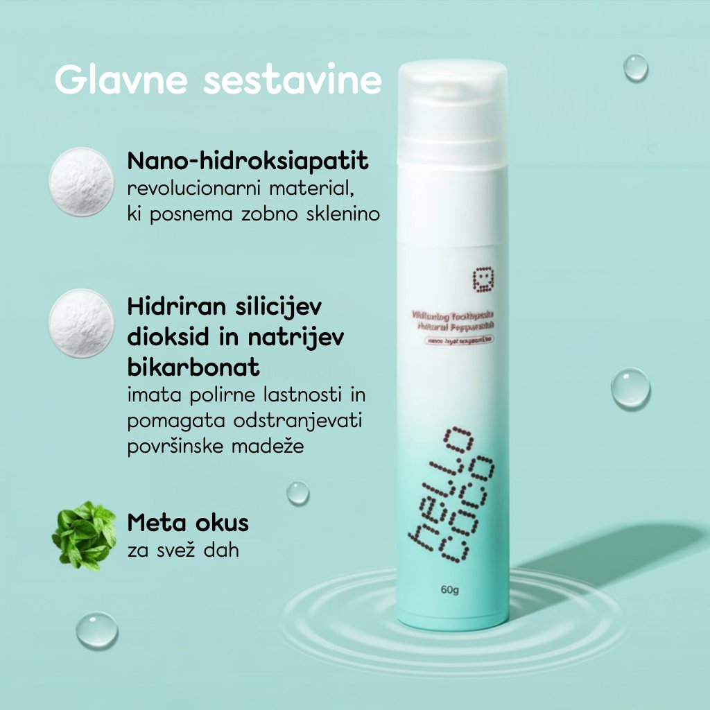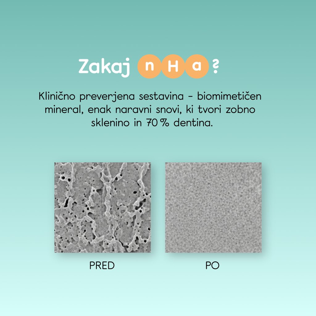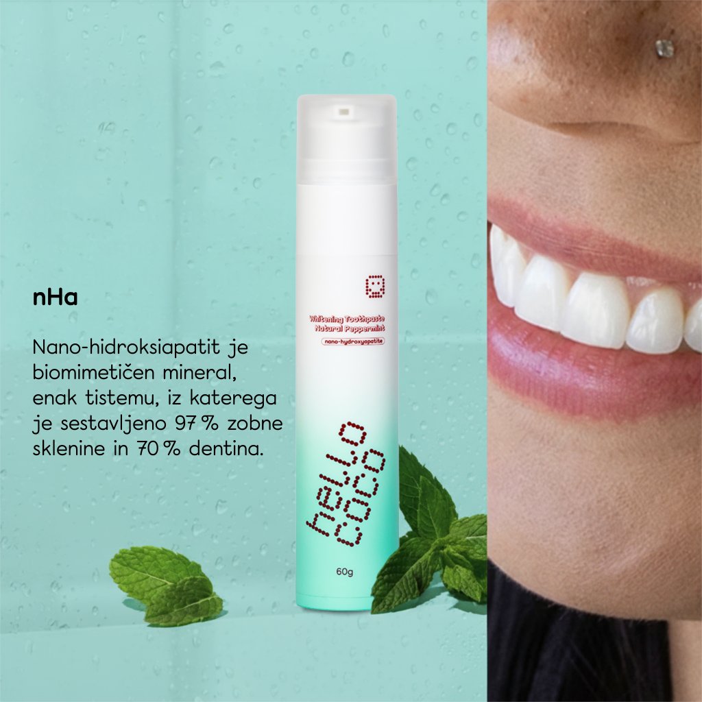 Nano-hidroksiapatit (n-Ha), revolucionarni napredek v negi zob. Hidroksiapatit je glavna sestavina zob in kosti, ki pomaga pri remineralizaciji oslabljene sklenine in zmanjšuje občutljivost zob. Prav tako zgladi površino zob, zaradi česar so videti naravno bolj beli.