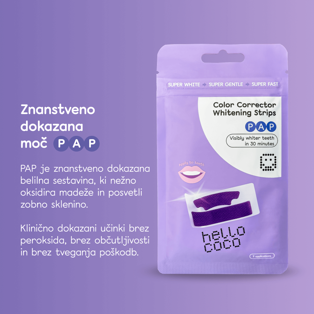 Tradicionalni belilni trakovi uporabljajo formulo na osnovi peroksida, ki lahko povzroči občutljivost zob. Namesto tega PAP trakovi Hello Coco uporabljajo formulo na osnovi PAP brez občutljivosti.
