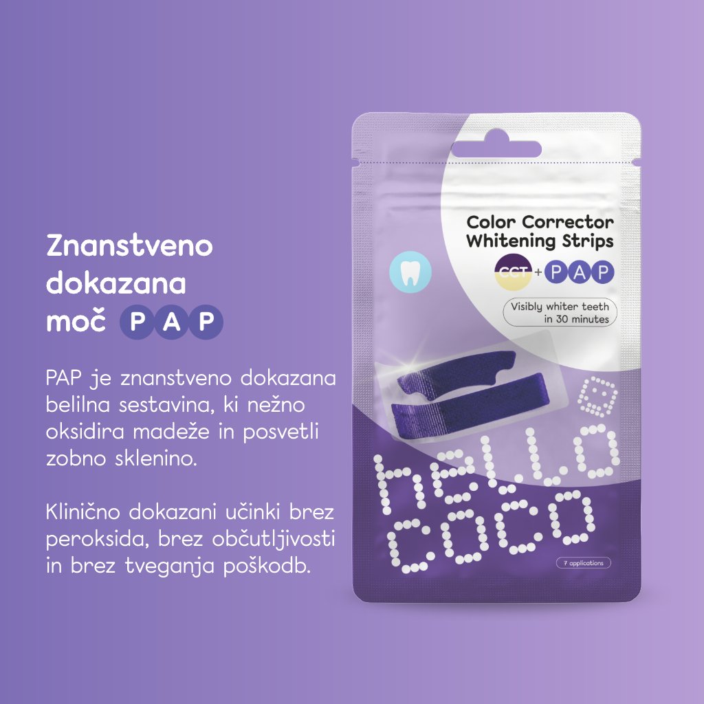 Tradicionalni belilni trakovi uporabljajo formulo na osnovi peroksida, ki lahko povzroči občutljivost zob. Namesto tega PAP trakovi Hello Coco uporabljajo formulo na osnovi PAP brez občutljivosti.